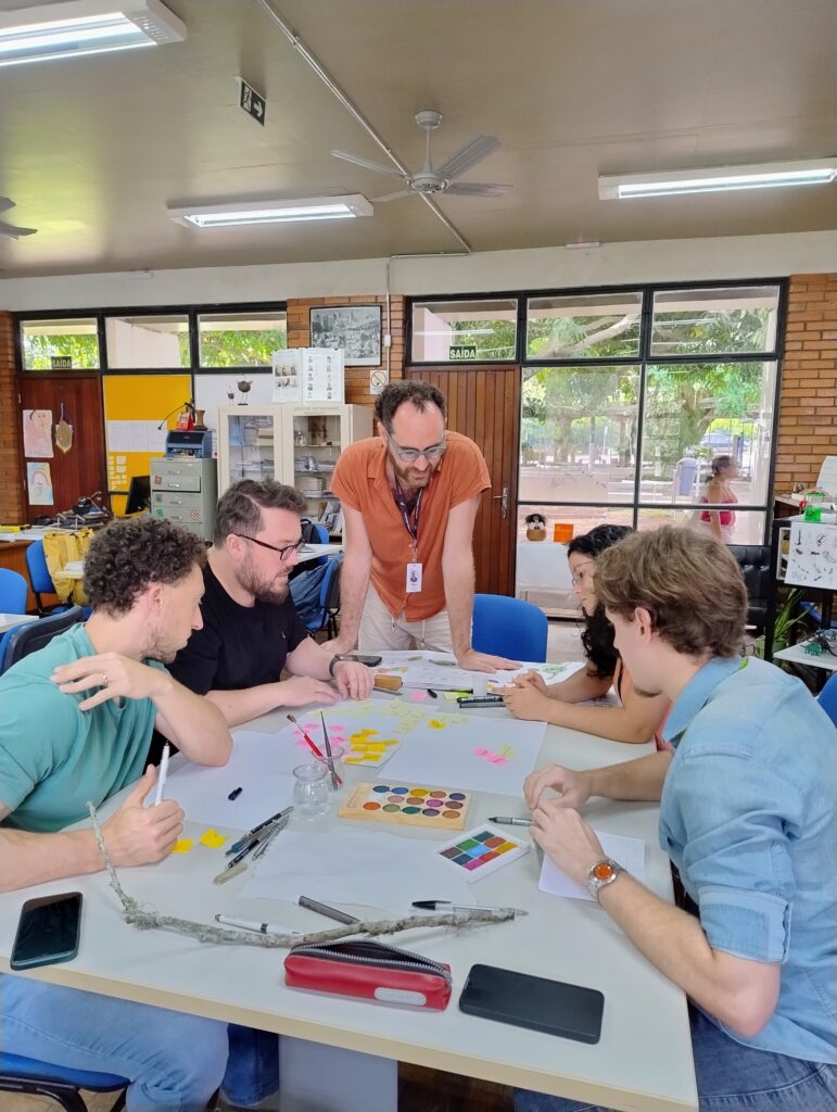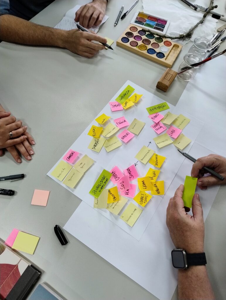 Para realizar um trabalho manual de organização de ideias para o parque, a equipe se dividiu em dois grupos. Nessa dinâmica, focaram no planejamento de materiais de apoio e na sustentabilidade do espaço. Foram discutidas a criação de manuais de manutenção e limpeza, guias práticos e a elaboração de placas informativas que vão explicar sobre o desenvolvimento infantil e orientar sobre o uso seguro dos equipamentos.