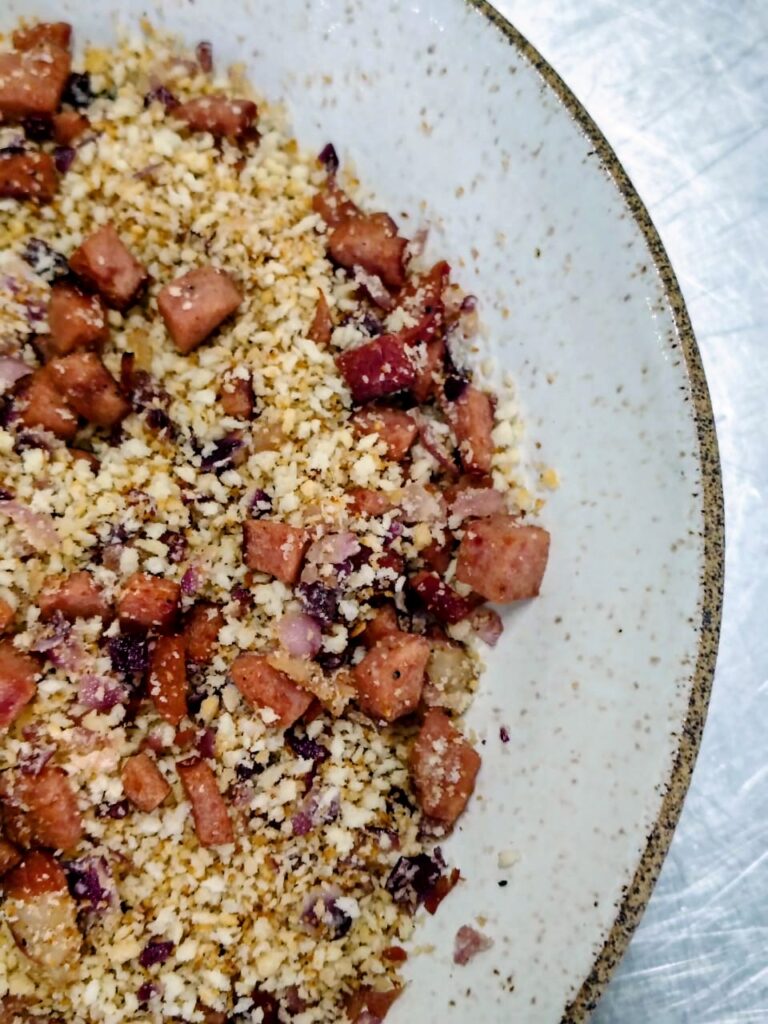 Para encerrar o cronograma de abril, a aula ganhou um ingrediente especial: a escuta e o carinho. Atendendo a um pedido especial das alunas do Quilombo Chácara das Rosas, a turma preparou a “farofa favorita”, feita com bacon, cebola e alho.