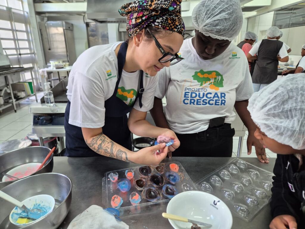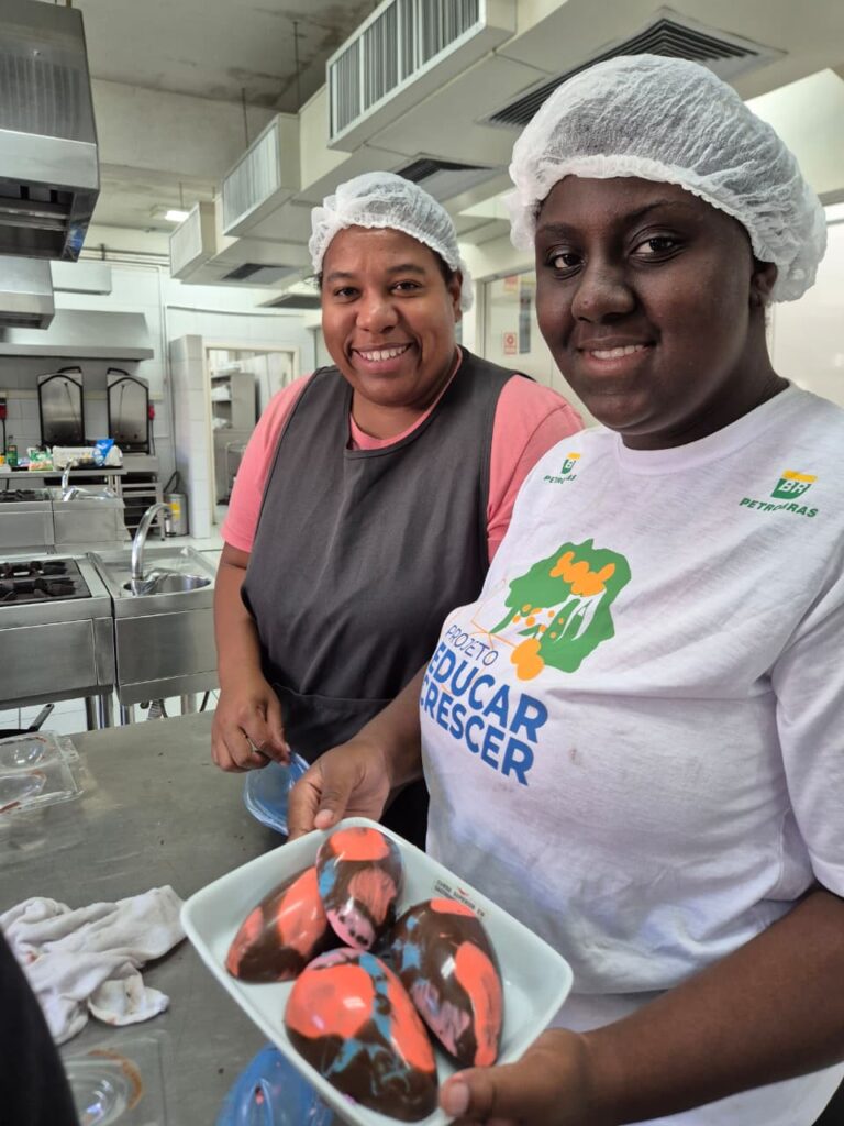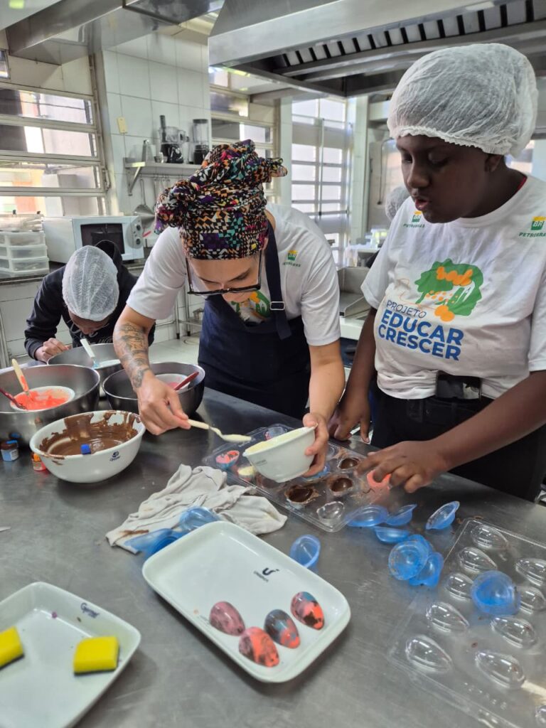 Segundo Rafaely, a equipe do projeto também escolheu forminhas de acetato que têm um preço de mercado mais acessível, sempre pensado na possibilidade das alunas usarem a técnica de trabalhar com chocolate como geração de renda. “Todo mundo aqui já participou de produção de Páscoa de casa e, hoje, as meninas vão levar os ovos produzidos por elas para dar para as crianças e isso é muito legal. Nossa intenção no projeto é sempre essa: que elas tragam o que é importante para elas e o que elas querem aprender”, afirmou.